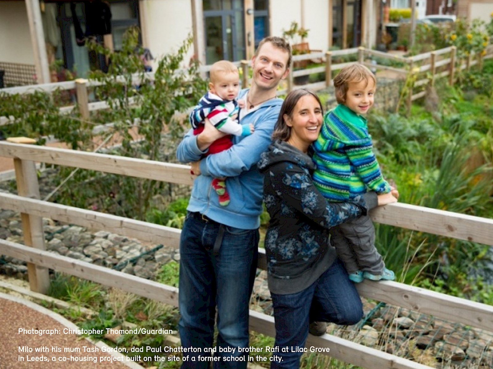Milo with his mum Tash Gordon, dad Paul Chatterton and baby brother Rafi at Lilac Grove in Leeds, a co-housing project built on the site of a former school in the city.