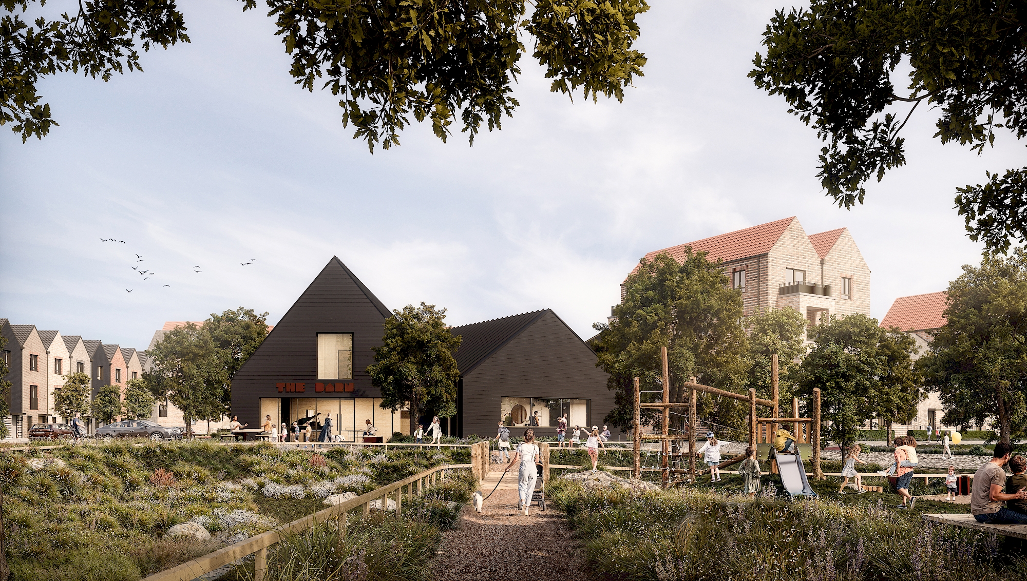 Taking inspiration from farm, barn and cottage typologies the character areas vary in density, from regular blocks arranged around green squares to homes facing onto a linear park, informed by the formal Georgian and early Victorian suburbs of Cambridge. Attractive green spaces and play areas provide safe routes to the local centre and proposed school.